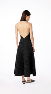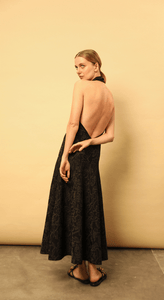 The Amapola Dress features a high halter neckline and a beautifully fitted bodice, it flows into a flared, midi-length skirt with graceful movement. The intricate eyelet detailing adds texture and depth to the fabric, while the open back brings a striking and unexpected finish—perfect for both day and evening occasions.