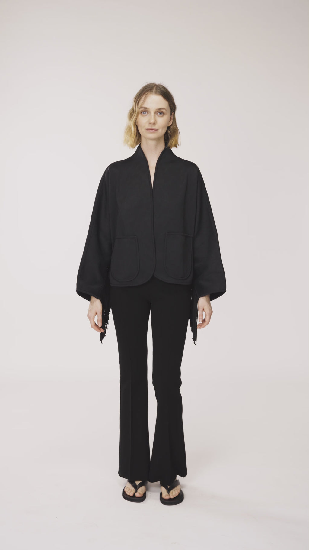 The Calluna Jacket is a chic straight-cut piece crafted from 100% recycled polyester. Its delicate animal ikat print, handmade fringes, visible stitching, and large front pockets add a distinctive bohemian touch.