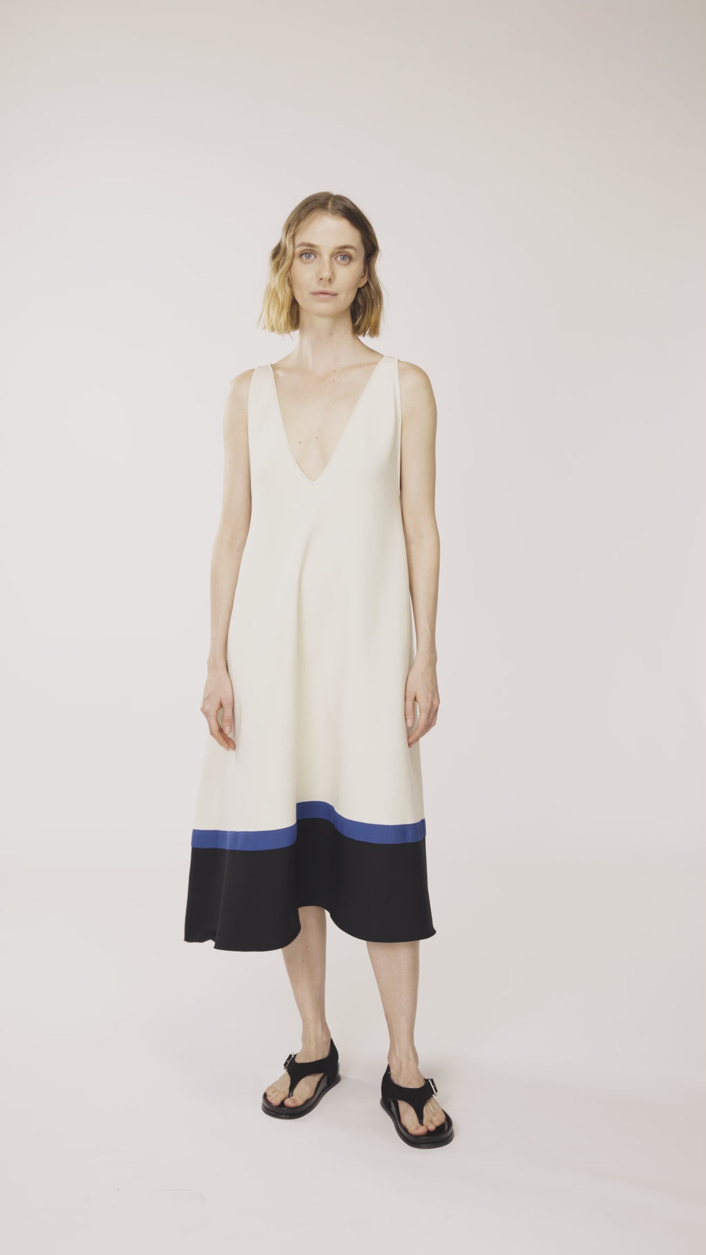 The Eira Dress is a lightweight knit midi dress with a deep V-neck and bold color-block hem — effortless, elegant, and perfect for day-to-night gatherings.
